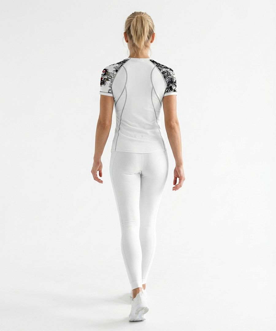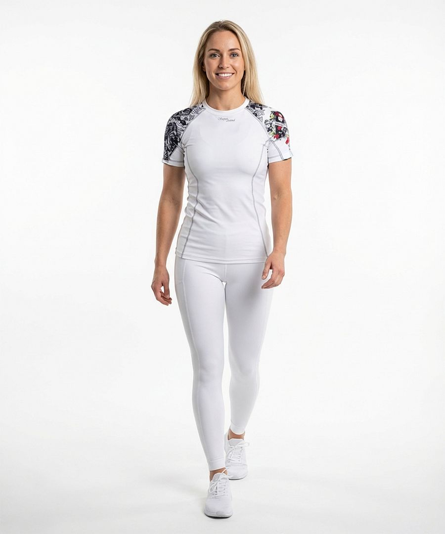 LADY, toto skvělé dámské funkční triko s krátkým rukávem v bílé barvě, s originálním potiskem mexické květinové Santa Muerte a s jemným světle šedým prošitím, které pro vás šijeme z materiálu Bamboo Light New, vám rozhodně nesmí v šatníku chybět. Bamboo Light je náš materiál střední gramáže se změkčující úpravou jemným pobroušením, takzvaným SKIN PEACH EFFECT, tedy efektem broskvové kůže, který má navíc výborné termoregulační vlastnosti, které vám zajistí komfort při nošení.