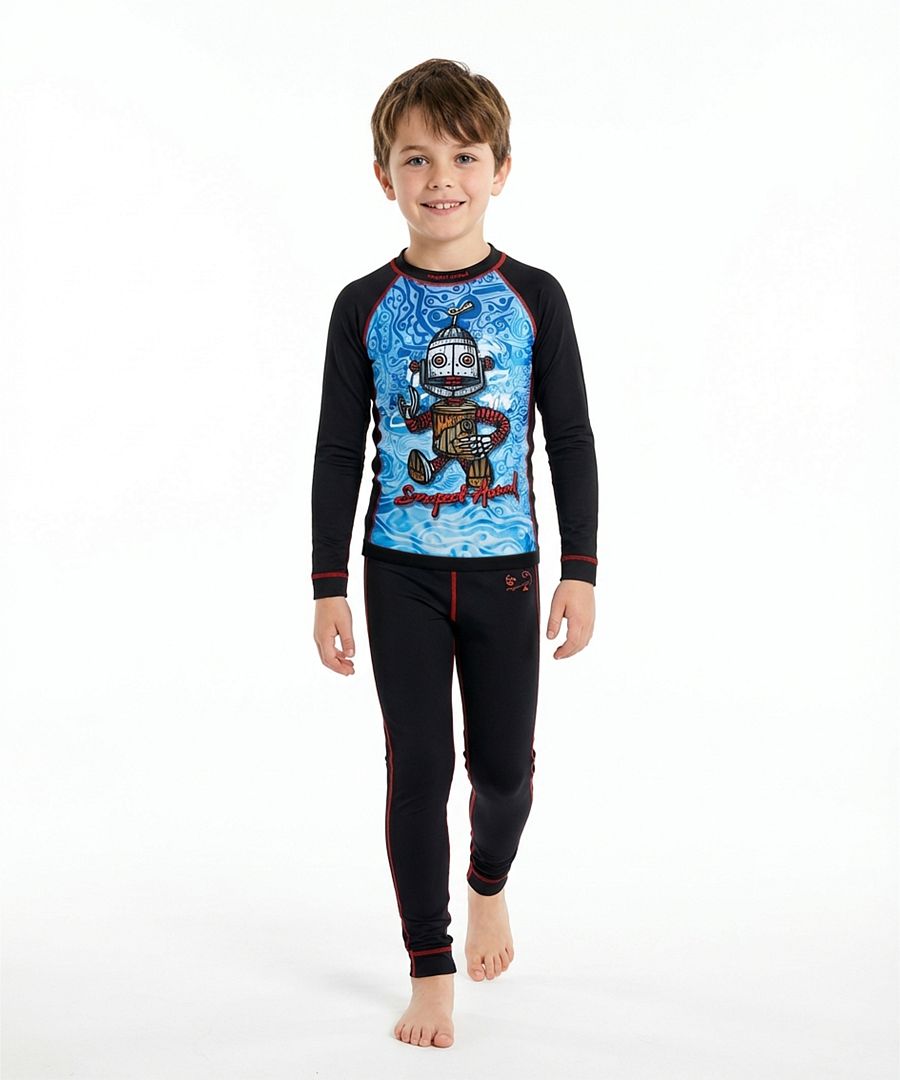 Pro všechny malé vynálezce, kteří milují všechna ta chytrá technická udělátka a mechanizmečky bez obav pořiďte náš výhodný set funkčního prádla ROBOT v černé barvě s originálním potiskem z lehkého materiálu Bamboo Light New se změkčující úpravou jemným pobroušením, takzvaným SKIN PEACH EFFECT, tedy efektem broskvové kůže, který dává výrobku mimořádně příjemný pocit na dotek a zajišťuje výbornou termoregulaci. Jedná se o ekologicky šetrný materiál, jelikož bambus k růstu nepotřebuje chemické ošetření ani velké množství vody. V balení setu dětského funkčního prádla najdete funkční tričko s dlouhým rukávem, kulatým výstřihem a všitým lemem a dlouhé spodky zakončené pohodlnou širokou manžetou. Navíc naše prádlo obsahuje antibakteriální složku Bamboo Kun, která brání v množení bakterií a plísní. Set využijete nejen v zimě na lyže nebo na turistiku v přírodě, když vám nepřeje počasí. Díky originálnímu neokoukanému obrázku si váš potěr zafrajeří i jen tak ;) A mimo jiné v naší nabídce najdete i originální šátek ROBOT se stejnou grafikou jako tričko, který ochrání před větrem i chladnějším počasím a svůj klon vyladíte k naprosté dokonalosti.