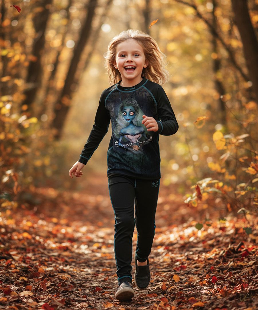 Okatá EMILY je správná volba pro vaše mláďátka! Bez obav pořiďte náš výhodný set funkčního prádla v černé barvě s originálním potiskem mrtvé nevěsty skoro jako jako od Tima Burtona z teplého materiálu Bamboo Heavy, který dává výrobku mimořádně příjemný pocit na dotek a zajišťuje výbornou termoregulaci. Jedná se o ekologicky šetrný materiál, jelikož bambus k růstu nepotřebuje chemické ošetření ani velké množství vody. V balení setu dětského funkčního prádla najdete funkční tričko s dlouhým rukávem, kulatým výstřihem a všitým lemem a dlouhé spodky zakončené pohodlnou širokou manžetou. Navíc naše prádlo obsahuje antibakteriální složku Bamboo Kun, která brání v množení bakterií a plísní. Set využijete nejen v zimě na lyže nebo na turistiku v přírodě, když vám nepřeje počasí. Díky originálnímu neokoukanému obrázku si váš potěr zafrajeří i jen tak ;) A mimo jiné v naší nabídce najdete i originální šátek EMILY se stejnou grafikou jako tričko, který ochrání před větrem i chladnějším počasím a svůj klon vyladíte k naprosté dokonalosti.