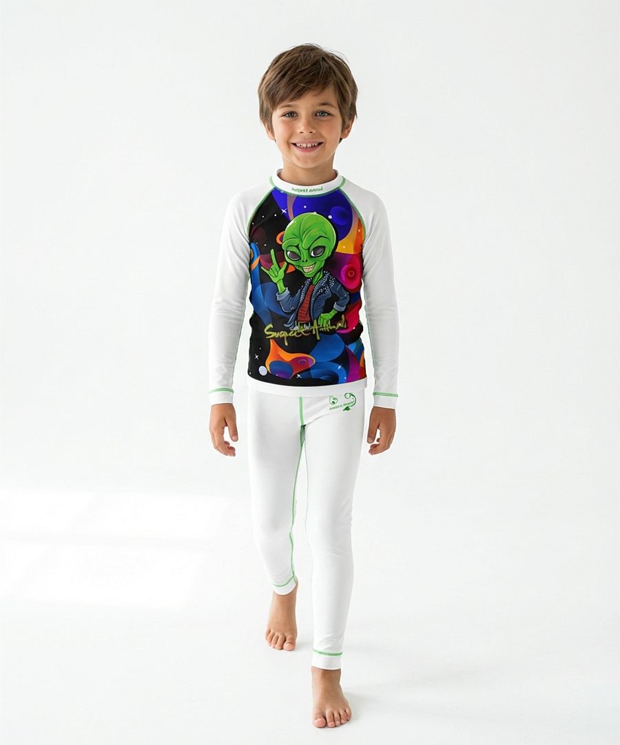 I svým mláďátkům bez obav pořiďte náš výhodný set funkčního prádla ALIEN v bílé barvě s originálním potiskem veselého ufonka z lehkého materiálu Bamboo Light New se změkčující úpravou jemným pobroušením, takzvaným SKIN PEACH EFFECT, tedy efektem broskvové kůže, který dává výrobku mimořádně příjemný pocit na dotek a zajišťuje výbornou termoregulaci. Jedná se o ekologicky šetrný materiál, jelikož bambus k růstu nepotřebuje chemické ošetření ani velké množství vody. V balení setu dětského funkčního prádla najdete funkční tričko s dlouhým rukávem, kulatým výstřihem a všitým lemem a dlouhé spodky zakončené pohodlnou širokou manžetou. Navíc naše prádlo obsahuje antibakteriální složku Bamboo Kun, která brání v množení bakterií a plísní. Set využijete nejen v zimě na lyže nebo na turistiku v přírodě, když vám nepřeje počasí. Díky originálnímu neokoukanému obrázku si váš potěr zafrajeří i jen tak ;) A mimo jiné v naší nabídce najdete i originální šátek ALIEN se stejnou grafikou jako tričko, který ochrání před větrem i chladnějším počasím a svůj klon vyladíte k naprosté dokonalosti.