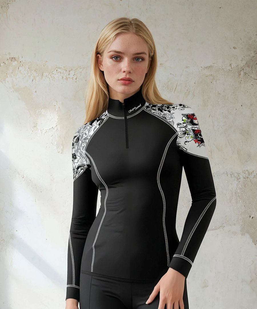 LADY, toto skvělé dámské funkční triko se zipem v černé barvě, s originálním potiskem mexické květinové Santa Muerte a s kontrastním bílým prošitím, které pro vás šijeme z materiálu Bamboo Light New, vám rozhodně nesmí v šatníku chybět. Zip je krytý praktickým podložením aby na krku a pod bradou neškrábal. Bamboo Light je náš materiál střední gramáže se změkčující úpravou jemným pobroušením, takzvaným SKIN PEACH EFFECT, tedy efektem broskvové kůže, který má navíc výborné termoregulační vlastnosti, které vám zajistí komfort při nošení.