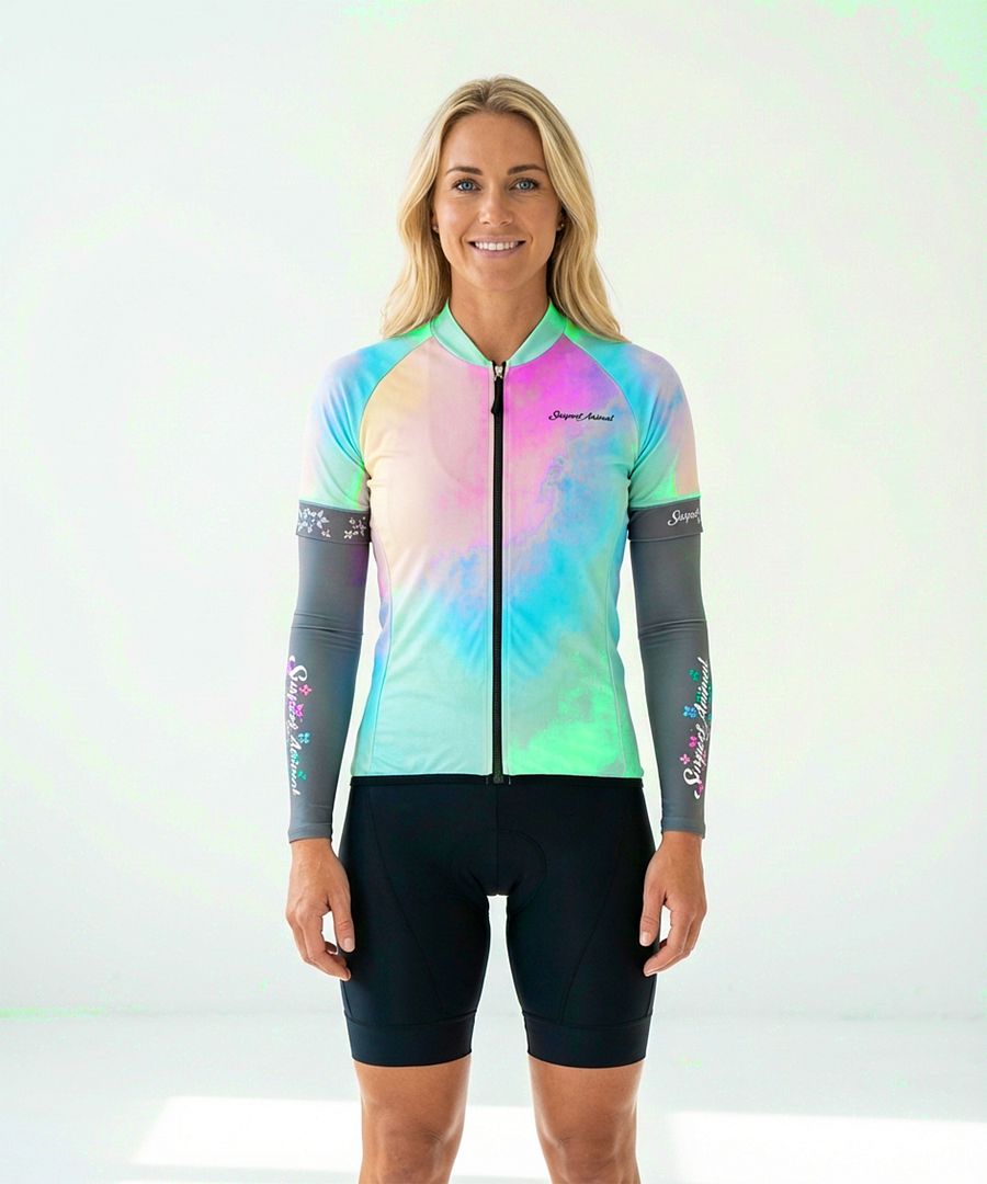 Představujeme vám novinku - dámský cyklistický dres Aquarelle Rainbow s krátkým rukávem a předním dlouhým zipem v naší limitované edici Suspect Animal. Dres má prodloužený zadní díl, který zabezpečí plné pokrytí v jezdecké pozici a tři zadní otevřené kapsy s reflexním bezpečnostním páskem ve švu kapsy.
