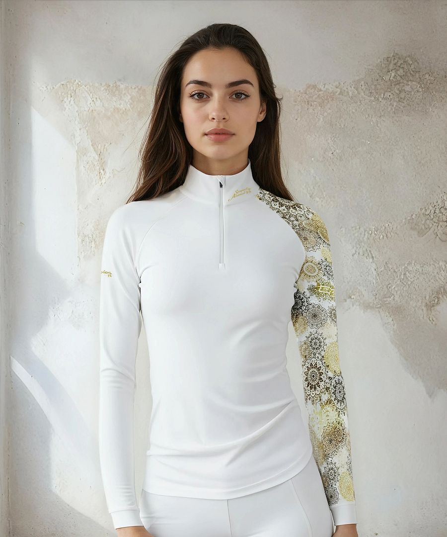 GOLDEN EYE, toto skvělé dámské funkční triko se zipem v bílé barvě, s neutrálním elegantním prošitím a s originálním potiskem zlatých mandal, které pro vás šijeme z materiálu Bamboo Thermo vám rozhodně nesmí v šatníku chybět. Ekologický zip YKK NATULON®, který je vyrobený z recyklovaných materiálů je krytý praktickým podložením aby na krku a pod bradou neškrábal. Bamboo Thermo je náš materiál s nejvyšší gramáží, který má navíc výborné termoregulační vlastnosti, které vám zajistí komfort při nošení a je vhodný nejen ke kombinaci a vrstvení, ale i samostaně na zimu.