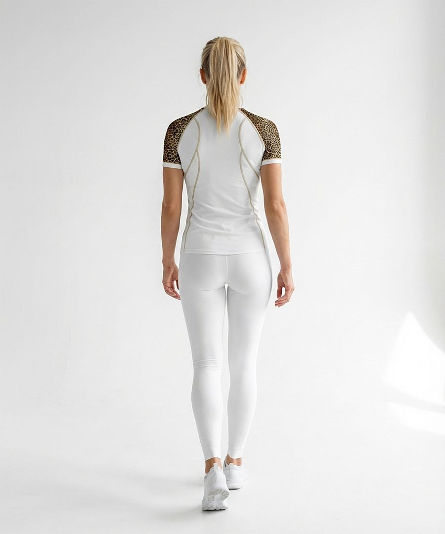 LEO, toto skvělé dámské funkční triko s krátkým rukávem v bílé barvě, s originálním hnědým leopardím potiskem a s prošitím v barvě potisku, které pro vás šijeme z materiálu Bamboo Light New, vám rozhodně nesmí v šatníku chybět. Bamboo Light je náš materiál střední gramáže se změkčující úpravou jemným pobroušením, takzvaným SKIN PEACH EFFECT, tedy efektem broskvové kůže, který má navíc výborné termoregulační vlastnosti, které vám zajistí komfort při nošení.