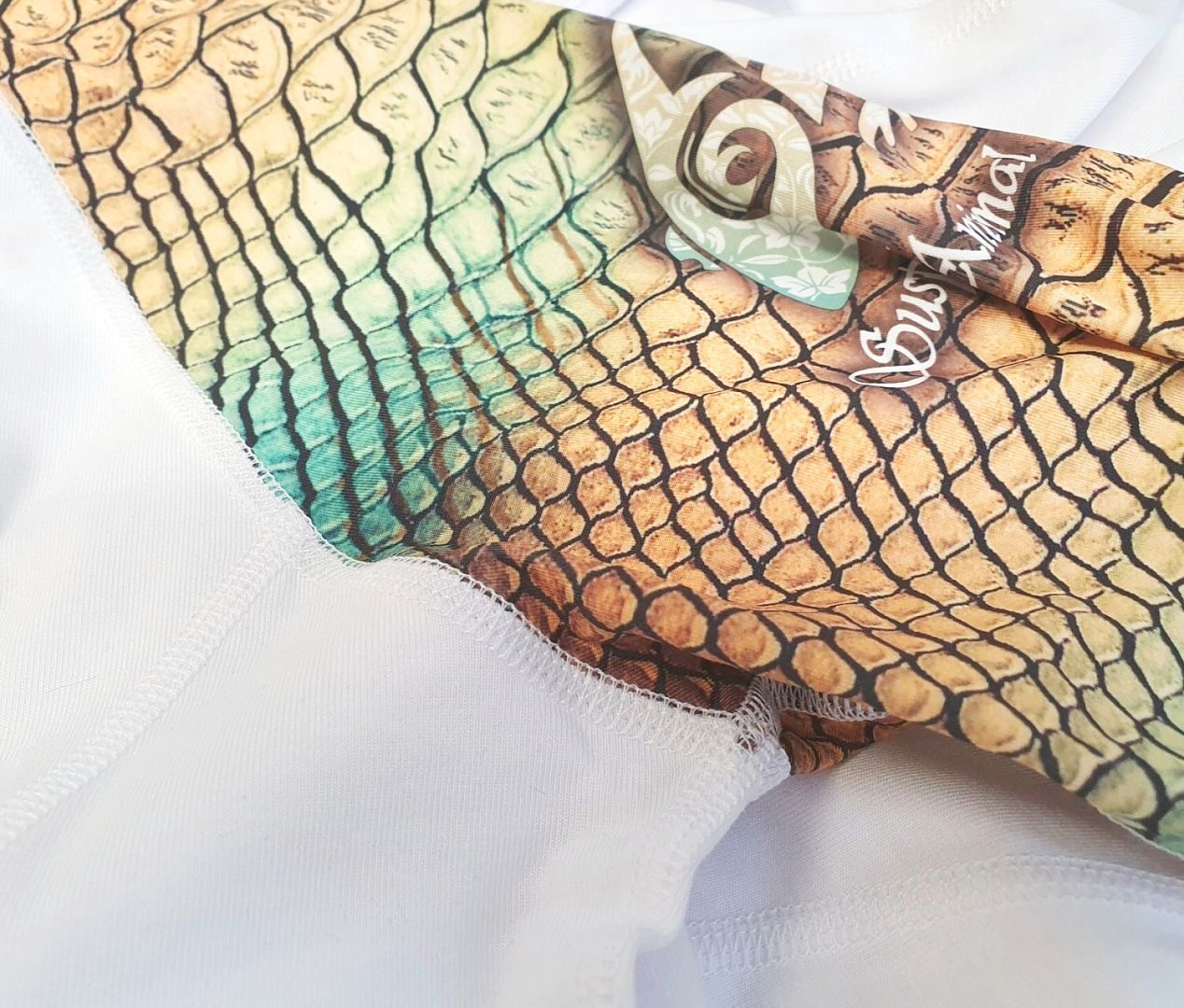 CROCODILE LADY, toto skvělé dámské funkční triko s krátkým rukávem v bílé barvě, s neutrálním prošitím a s originálním potiskem krokodýlí kůže, které pro vás šijeme z materiálu Bamboo Ultra vám rozhodně nesmí v šatníku chybět. Bamboo Ultra je náš materiál s nejnižší gramáží, který má navíc výborné termoregulační vlastnosti, které vám zajistí komfort při nošení. Naše dámské funkční prádlo obsahuje přírodní antibakteriální složku Bamboo Kun, díky které nedochází k rozkladu potu a nežádoucímu zápachu. Je rozhodně vhodné pro ženy náchylnější k alergiím, trpící ekzémy a s citlivou pokožkou. V našem tričku si odskočte je tak na procházku v přírodě, na jógu a pilates, na kolo a nebo si zaběhat. K tričku se vám bude hodit i multifunkční šátek se stejným potiskem, který využijete jako ochranu krku nebo hlavy před větrem. Místo šátku můžete zkusit i funkční čelenku nebo čepici. K tričkům pak pro vás máme i skvělé sportovní topy nebo kalhotky, se kterými můžete vytvořit dokonalý komplet.