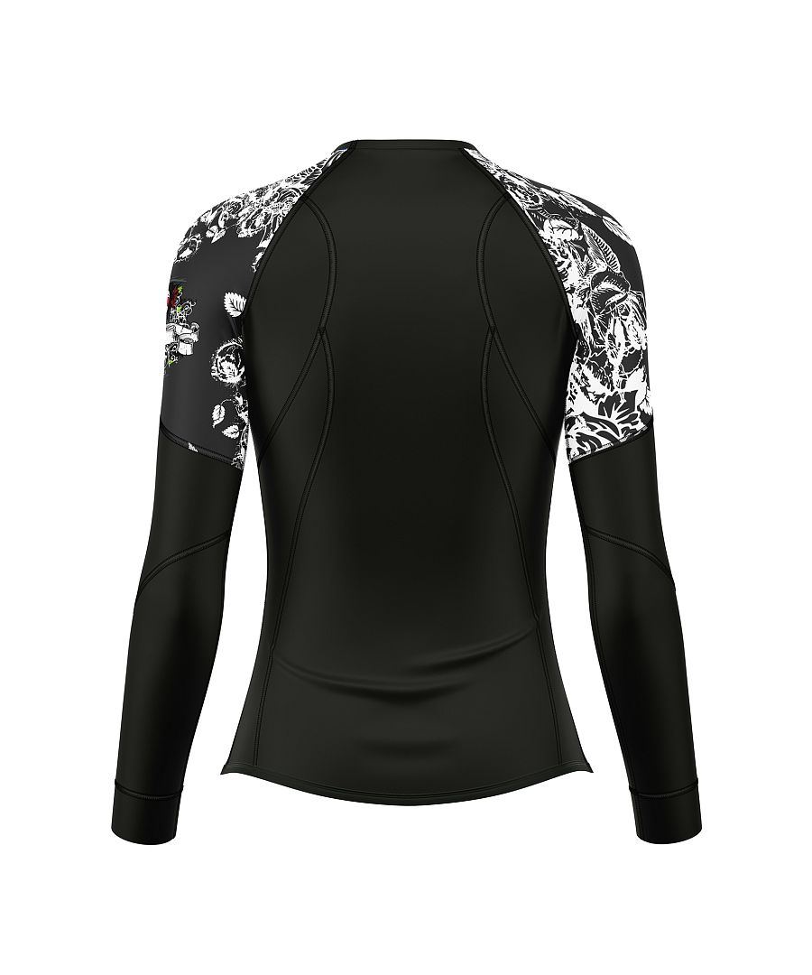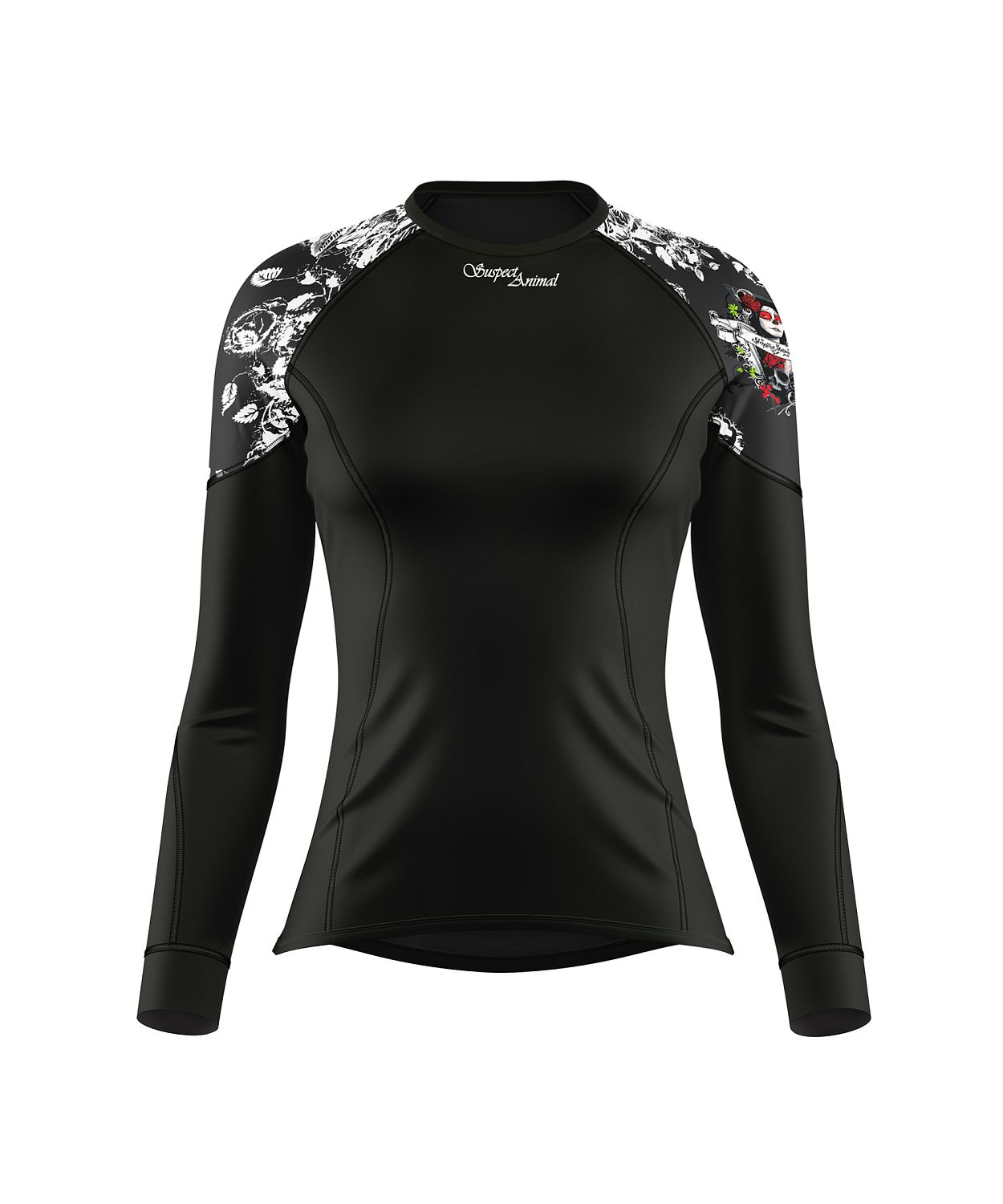 LADY ELEGANT, toto skvělé dámské funkční triko s dlouhým rukávem v černé barvě, s elegantním neutrálním prošitím a s originálním potiskem mexické květinové Santa Muerte, které pro vás šijeme z materiálu Bamboo Light New, vám rozhodně nesmí v šatníku chybět. Bamboo Light je náš materiál střední gramáže se změkčující úpravou jemným pobroušením, takzvaným SKIN PEACH EFFECT, tedy efektem broskvové kůže, který má navíc výborné termoregulační vlastnosti, které vám zajistí komfort při nošení.