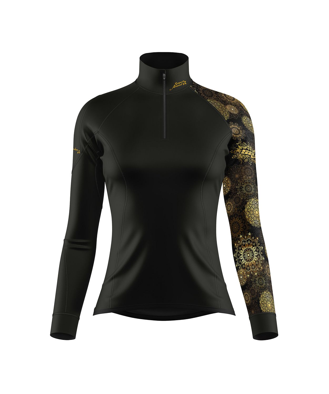 GOLDEN EYE, toto skvělé dámské funkční triko se zipem v černé barvě, s neutrálním elegantním prošitím a s originálním potiskem zlatých mandal, které pro vás šijeme z materiálu Bamboo Thermo vám rozhodně nesmí v šatníku chybět. Ekologický zip YKK NATULON®, který je vyrobený z recyklovaných materiálů je krytý praktickým podložením aby na krku a pod bradou neškrábal. Bamboo Thermo je náš materiál s nejvyšší gramáží, který má navíc výborné termoregulační vlastnosti, které vám zajistí komfort při nošení a je vhodný nejen ke kombinaci a vrstvení, ale i samostaně na zimu.