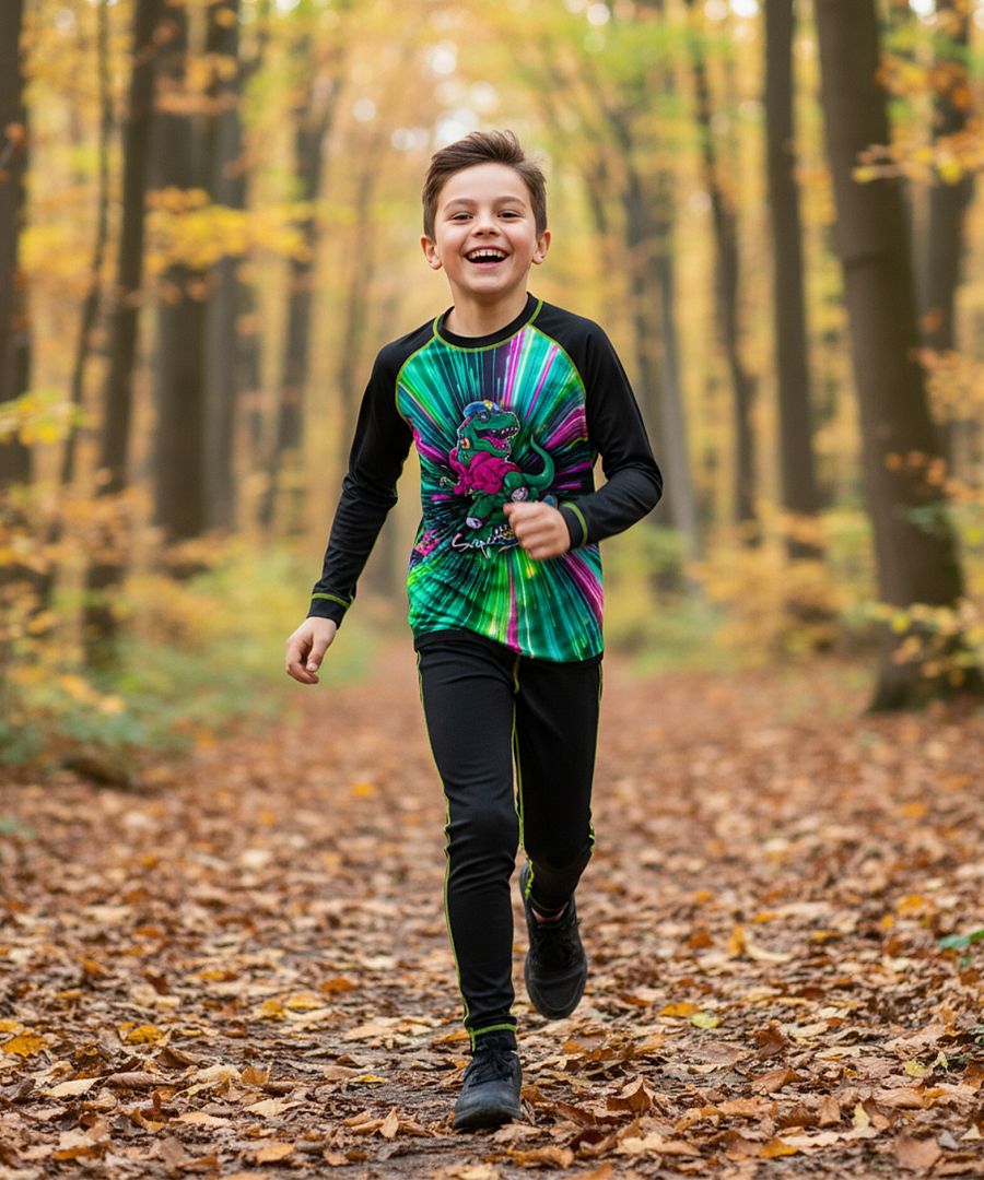 I svým mláďátkům bez obav pořiďte náš výhodný set funkčního prádla T-REX v černé barvě s originálním dinosauřím potiskem z lehkého materiálu Bamboo Ultra, který dává výrobku mimořádně příjemný pocit na dotek a zajišťuje výbornou termoregulaci. Jedná se o ekologicky šetrný materiál, jelikož bambus k růstu nepotřebuje chemické ošetření ani velké množství vody. V balení setu dětského funkčního prádla najdete funkční tričko s dlouhým rukávem, kulatým výstřihem a všitým lemem a dlouhé spodky zakončené pohodlnou širokou manžetou. Navíc naše prádlo obsahuje antibakteriální složku Bamboo Kun, která brání v množení bakterií a plísní. Set využijete nejen v zimě na lyže nebo na turistiku v přírodě, když vám nepřeje počasí. Díky originálnímu neokoukanému obrázku si váš potěr zafrajeří i jen tak ;) A mimo jiné v naší nabídce najdete i originální šátek T-REX se stejnou grafikou jako tričko, který ochrání před větrem i chladnějším počasím a svůj klon vyladíte k naprosté dokonalosti.