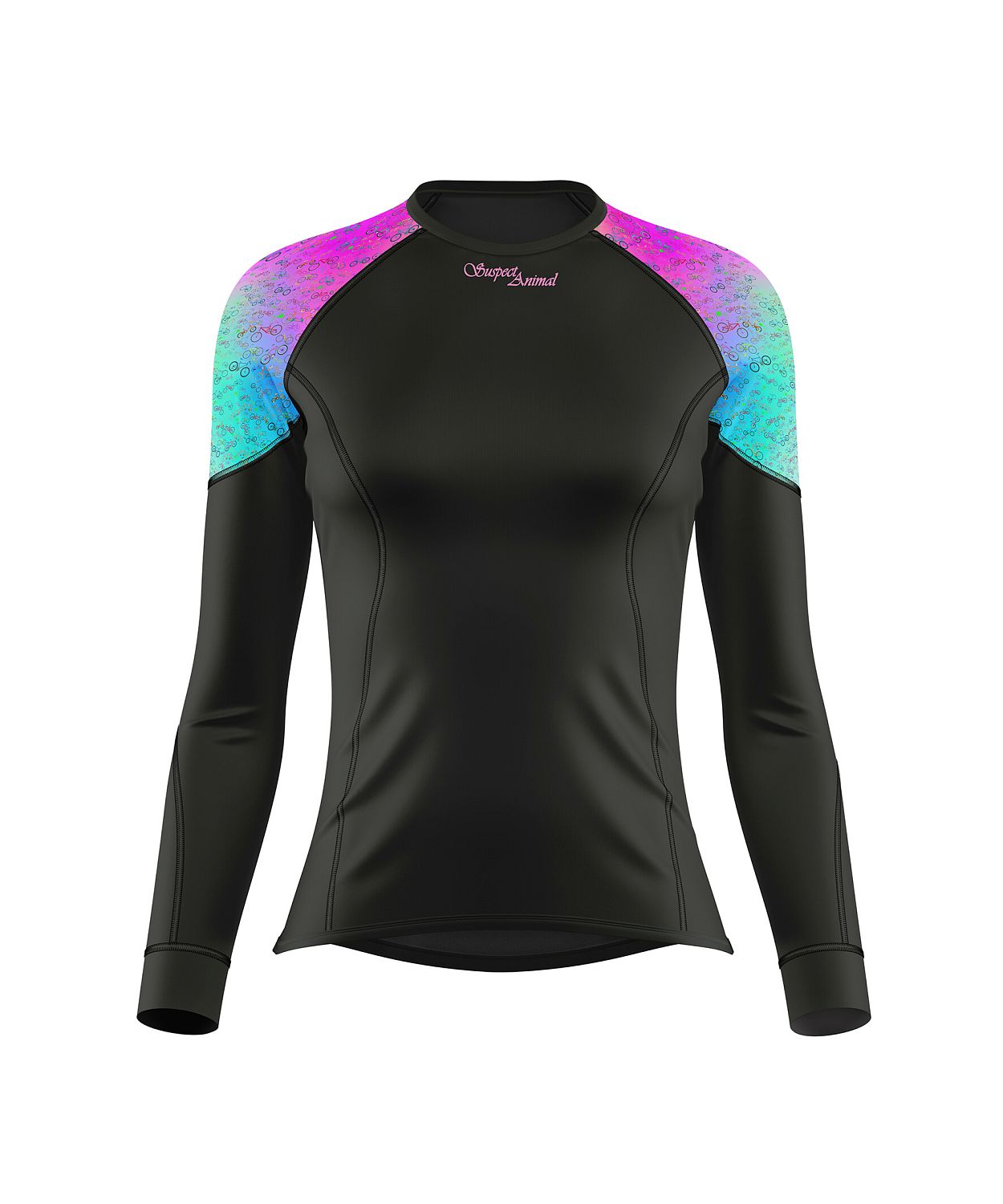 AQUARELLE LADY, toto skvělé dámské funkční triko s dlouhý rukávem v černé barvě, s neutrálním prošitím v barvě trika a s originálním potiskem tisíců malých bicyklů, které pro vás šijeme z materiálu Bamboo Light New, vám rozhodně nesmí v šatníku chybět. Bamboo Light je náš materiál střední gramáže se změkčující úpravou jemným pobroušením, takzvaným SKIN PEACH EFFECT, tedy efektem broskvové kůže, který má navíc výborné termoregulační vlastnosti, které vám zajistí komfort při nošení.