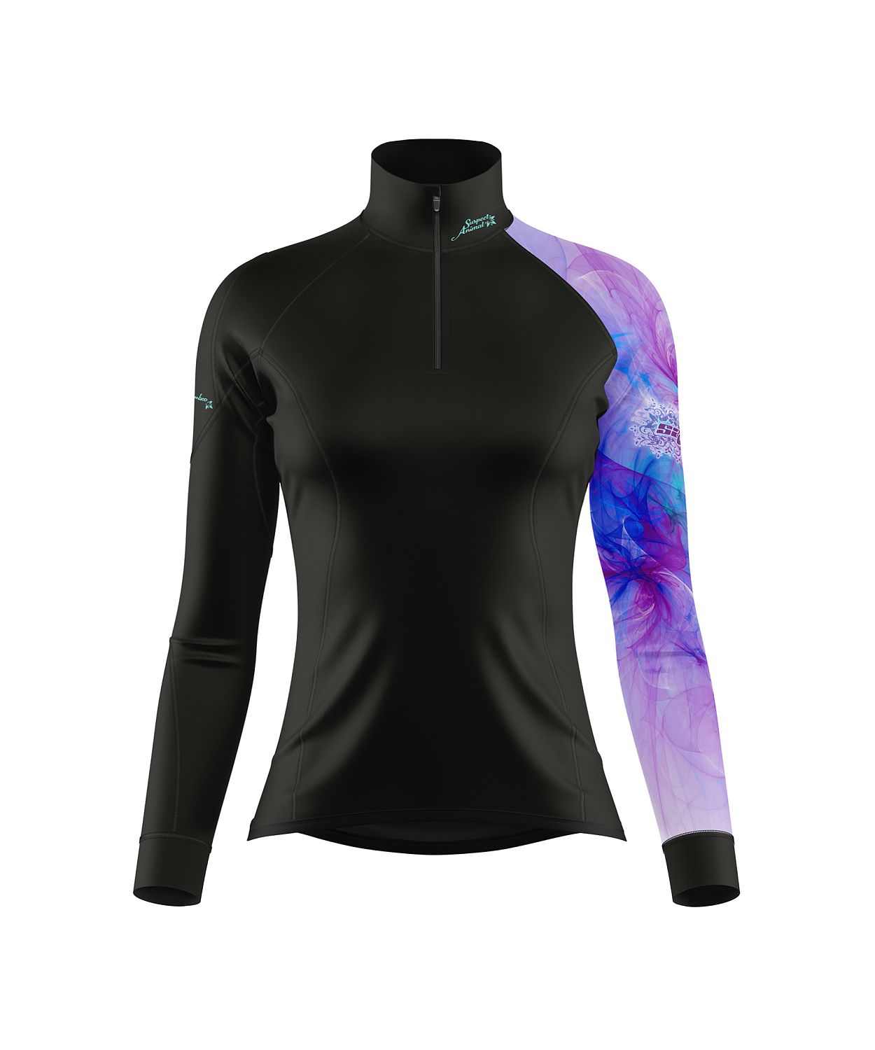 PURPLE, toto skvělé dámské funkční triko se zipem v černé barvě, s originálním abstraktním fialovým potiskem a s neutrálním elegantním prošitím, které pro vás šijeme z materiálu Bamboo Thermo vám rozhodně nesmí v šatníku chybět. Ekologický zip YKK NATULON®, který je vyrobený z recyklovaných materiálů je krytý praktickým podložením aby na krku a pod bradou neškrábal. Bamboo Thermo je náš materiál s nejvyšší gramáží, který má navíc výborné termoregulační vlastnosti, které vám zajistí komfort při nošení a je vhodný nejen ke kombinaci a vrstvení, ale i samostaně na zimu.