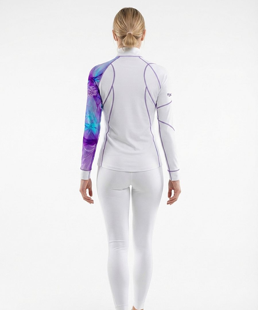 PURPLE, toto skvělé dámské funkční triko se zipem v bílé barvěoriginálním abstraktním fialovým potiskem a s kontrastním fialovým prošitím, které pro vás šijeme z materiálu Bamboo Heavy vám rozhodně nesmí v šatníku chybět. Ekologický zip YKK NATULON®, který je vyrobený z recyklovaných materiálů je krytý praktickým podložením aby na krku a pod bradou neškrábal. Bamboo Heavy je náš materiál s vyšší gramáží, který má navíc výborné termoregulační vlastnosti, které vám zajistí komfort při nošení a je vhodný nejen ke kombinaci a vrstvení, ale i samostaně na zimu.
