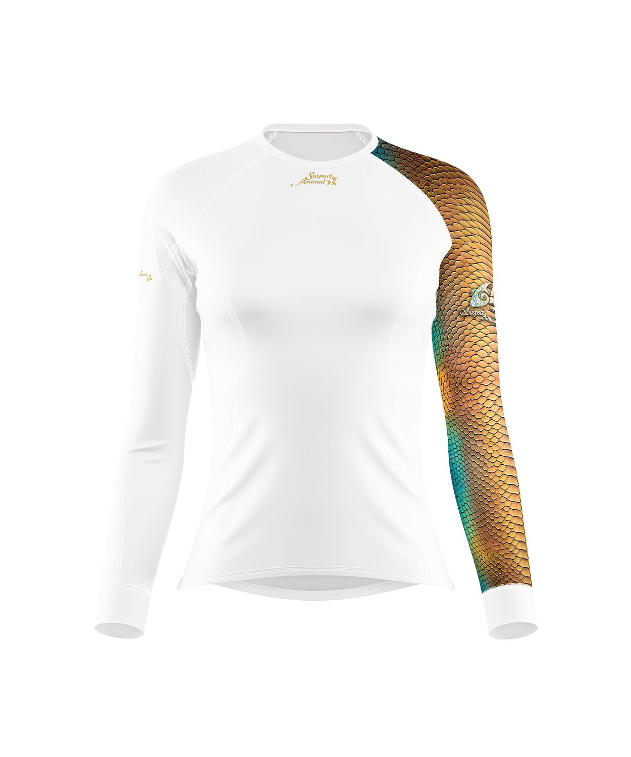 CROCODILE LADY, toto skvělé dámské funkční triko s dlouhým rukávem v bílé barvě, s neutrálním prošitím a s originálním potiskem krokodýlí kůže, které pro vás šijeme z materiálu Bamboo Thermo vám rozhodně nesmí v šatníku chybět. Bamboo Thermo je náš materiál s nejvyšší gramáží, který má navíc výborné termoregulační vlastnosti, které vám zajistí komfort při nošení a je vhodný nejen ke kombinaci a vrstvení, ale i samostaně na zimu.
