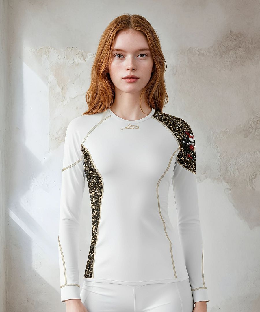 MUERTE, toto skvělé dámské funkční triko s dlouhým rukávem v bílé barvě, s originálním potiskem mexické Santa Muerte a s jemným světle hnědým prošitím, které pro vás šijeme z materiálu Bamboo Ultra vám rozhodně nesmí v šatníku chybět. Bamboo Ultra je náš materiál s nejnižší gramáží, který má navíc výborné termoregulační vlastnosti, které vám zajistí komfort při nošení.